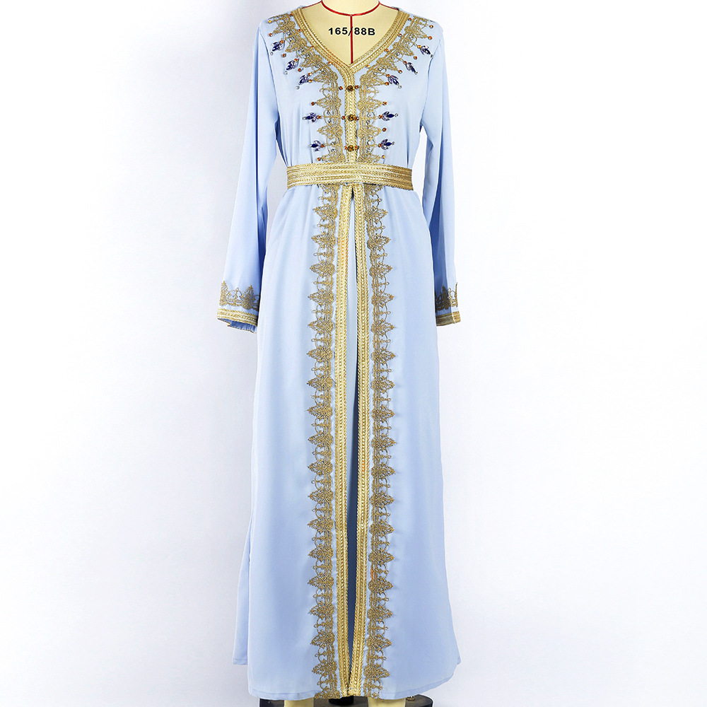 “Zahrat Samae” is decorated with distinctive decorations that reflect Morocco’s heritage in a modern and attractive style. The embroidered details sparkle elegantly against the background of the light blue kaftan, adding a charming touch that will make you the center of attention at any occasion.