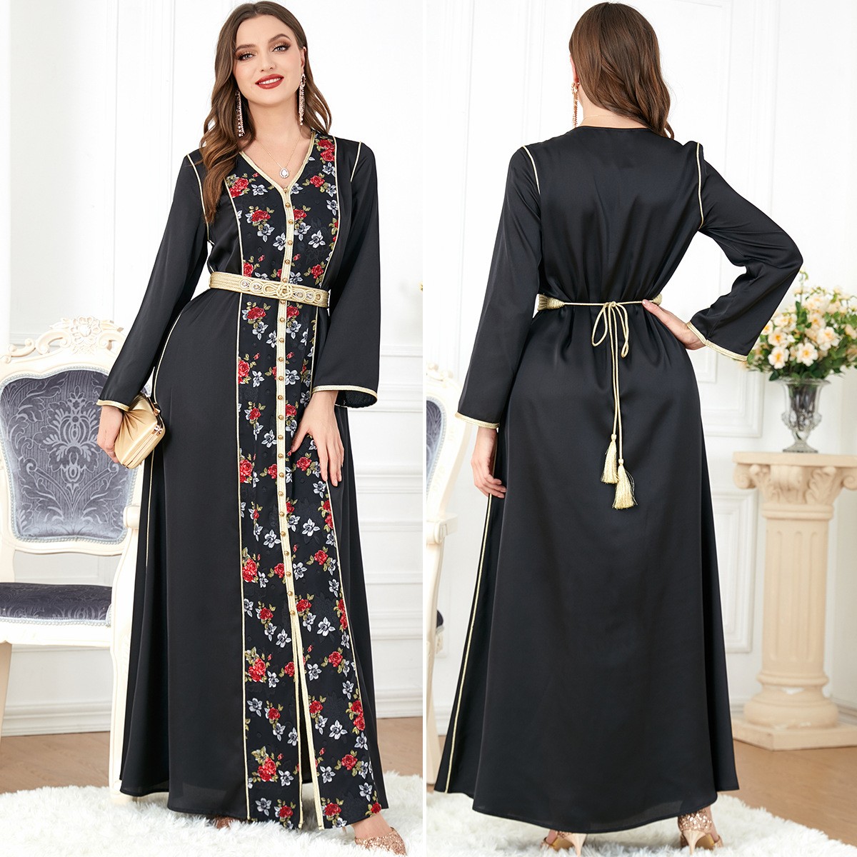 The Moroccan flower caftan is a masterpiece that combines refined elegance and sophisticated luxury. It comes with long sleeves and is decorated with beautiful flowers that shine from the neck to the bottom, adding a charming and sparkling touch to the look.