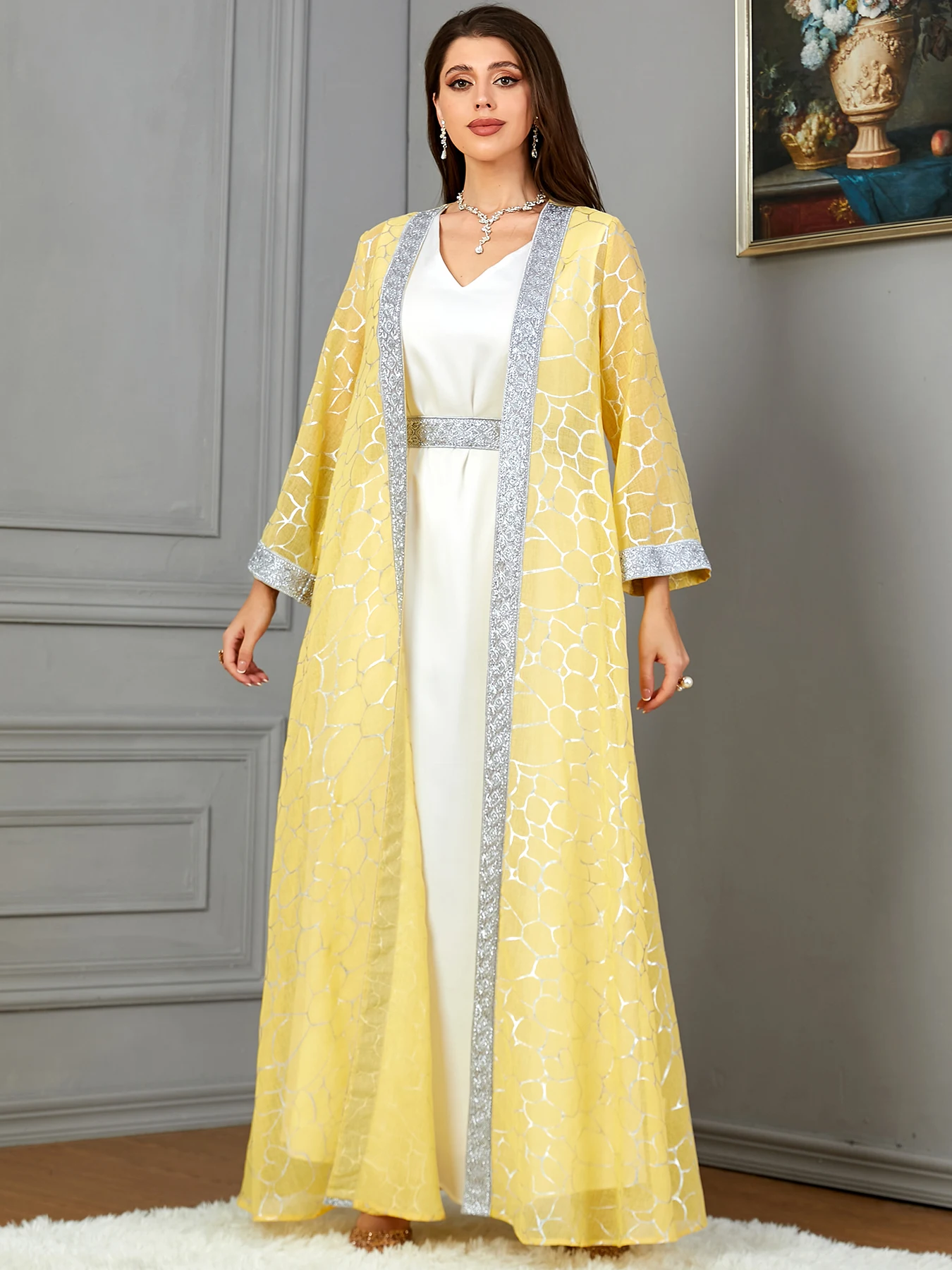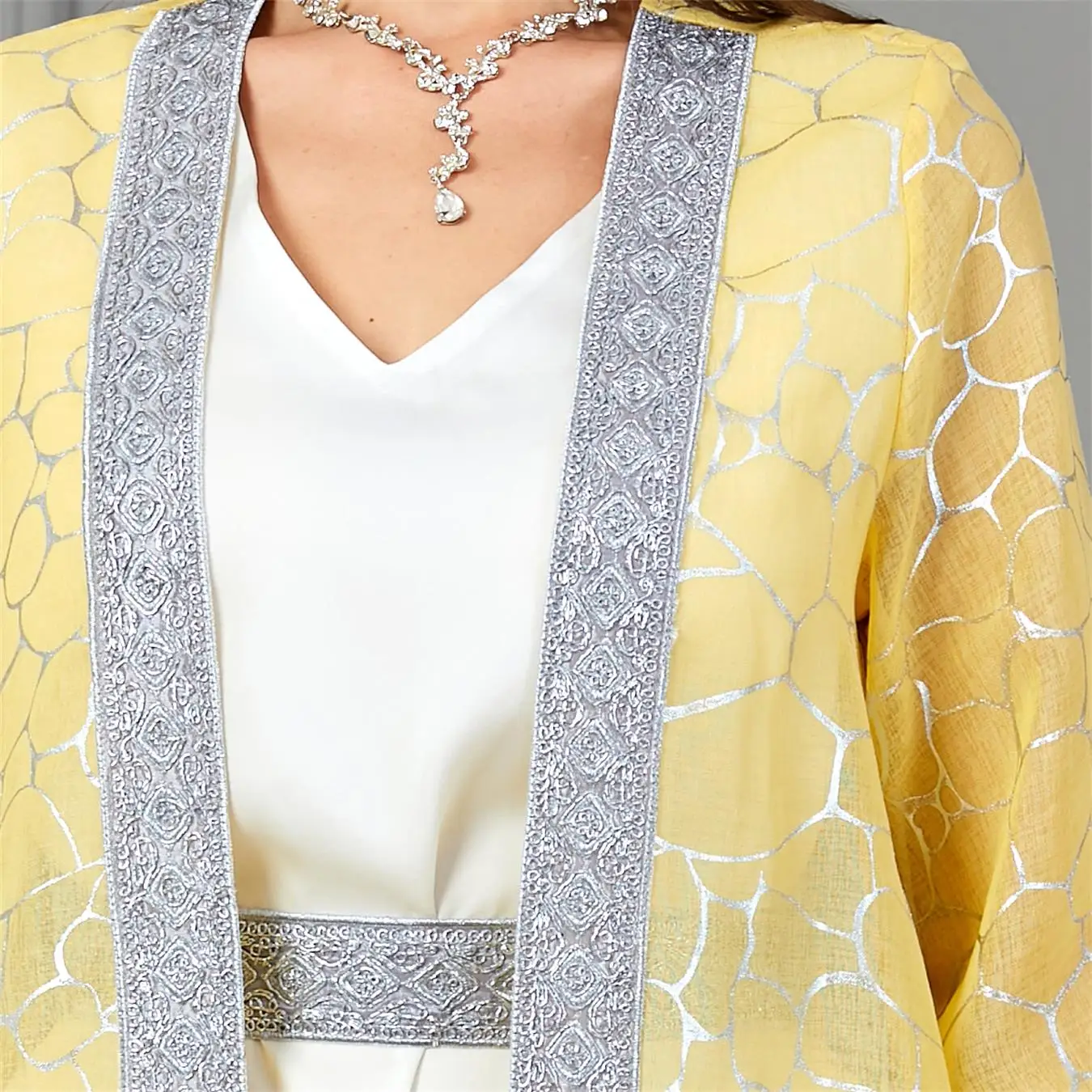The Moroccan Taqam Jalala consists of a long-sleeved kaftan in a charming golden color, decorated with distinctive details of cracked stones in a radiant gray color, giving it a touch of luxury and beauty.